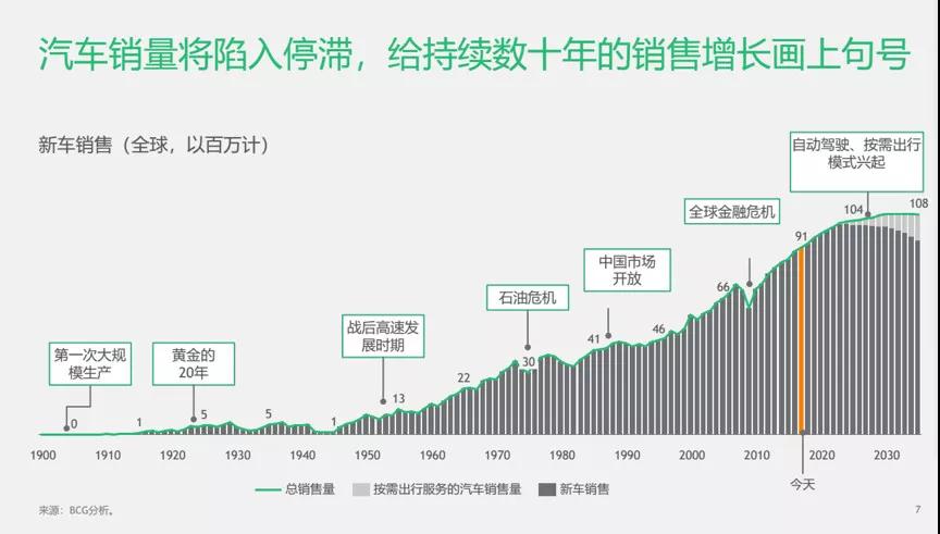 預測,在2025年之前新車銷售還將繼續(xù)大幅增長,主要是受中國和其他發(fā)展中市場的推動。但是在此之后,隨著中國銷量的增速減緩以及共享無人駕駛電動汽車的普及加快,汽車銷量將陷入停滯,給持續(xù)數(shù)十年的銷量增長畫上句號。