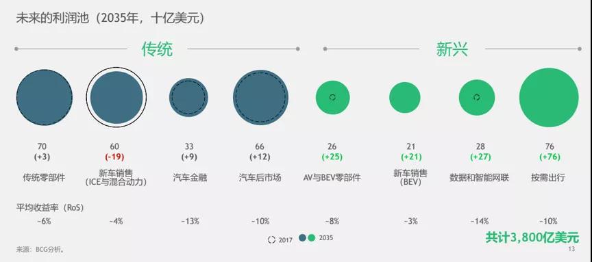 從BCG預測的利潤池結構可以發(fā)現(xiàn),2035年的行業(yè)利潤組成和2017年完全不同。