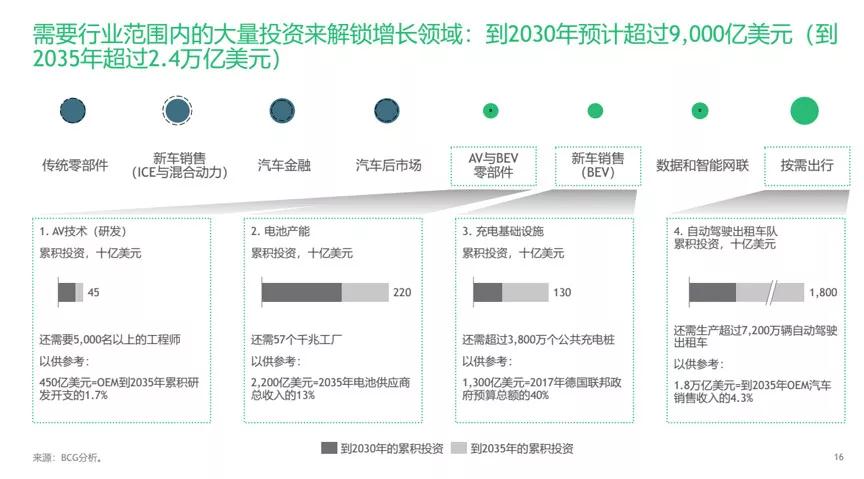 據(jù)BCG預測,為挖掘出行技術的潛在價值,行業(yè)參與者到2030年將需在新增長領域投入超過9000億美元,到2035年則要超過2.4萬億美元,重點投資領域包括自動駕駛汽車技術、電池生產(chǎn)設施、充電基礎設施和自動駕駛出租車隊。